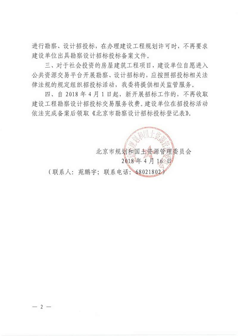 为落实《关于进一步优化营商环境深化建设项目行政审批流程改革的意见》(京规划国土发[2018]69号)相关精神,加快转变政府职能,建设服务型政府,切实减轻企业负担,更好地服务于企业办理行政审批事项,市规划国土委于近日下发《关于深化建设工程勘察设计招标投标改革的意见》(京规划国土函[2018]810号),明确对于社会投资的房屋建筑工程项目不再强制要求进行勘察、设计招投标,同时在办理建设工程规划许可时,不再要求建设单位出具勘察设计招标投标备案文件;2018年4月1日起,对于新开展招标工作的,不再收取建设工程勘察设计招投标交易服务费,估算每年将减少收费约1000万元。