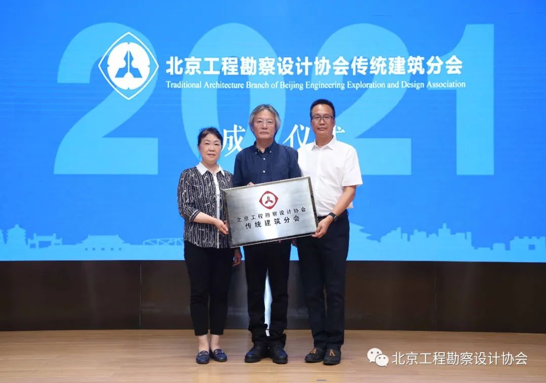 北勘设协副会长、中国建筑设计研究院有限公司总经理马海,北勘设协秘书长胡颐蘅代表协会向分会筹备单位的代表——北勘设协传统建筑分会会长、中国建筑设计研究院有限公司建筑历史研究所所长王力军授予协会“传统建筑分会”的牌匾。