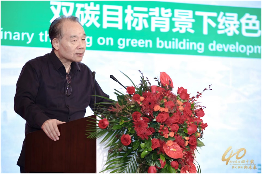 本次论坛邀请中国工程院院士、东南大学建筑学院教授王建国作题为《双碳目标背景下绿色建筑发展的初步思考》的主旨报告。报告针对“双碳目标”及其实现路径展开讨论,并着重从建筑结构形式和材料选择、建筑业行业转型技术路线、结合案例的建筑设计创新等方面进行了探讨。他认为低碳、减碳、近零碳、再到零碳建筑实现的技术路线和全链技术创新等具有关键性意义。