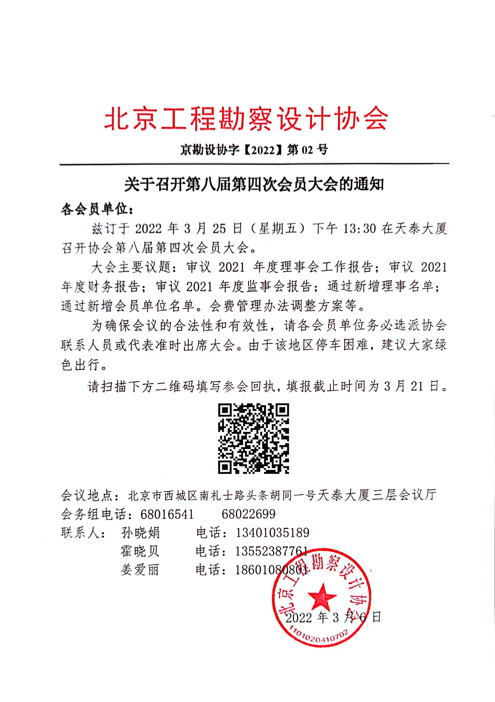 兹定于2022年3月25日(星期五)下午13:30在天泰大厦召开协会第八届第四次会员大会。