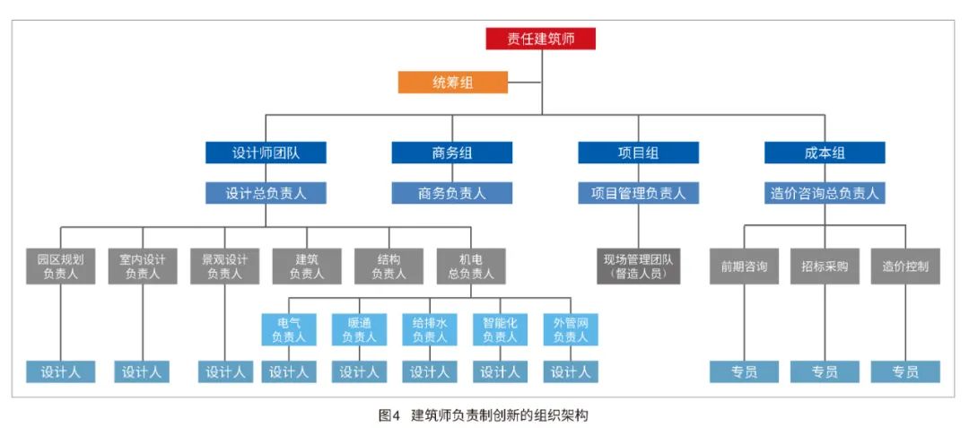 以图4所示的实际案例的创新组织架构为例,建筑师首先需要根据现有团队和内部管理的实际情况,构建对主要工作的分工管理条线:设计、商务、项目、成本。设计师团队除了要做好传统的设计及设计总包管理工作之外,还需延伸提供业主方项目管理服务,协助业主做出专业决策以及参与项目督造工作;商务团队负责分包合同管理工作,但其工作范围还需要拓展包含新增的分包合同如勘察、测量、电力设计、结构检测等;成本组工作将不仅仅局限于为设计提供估算和概算,其工作范围还包含了前期咨询、招标采购以及全过程的造价控制工作。