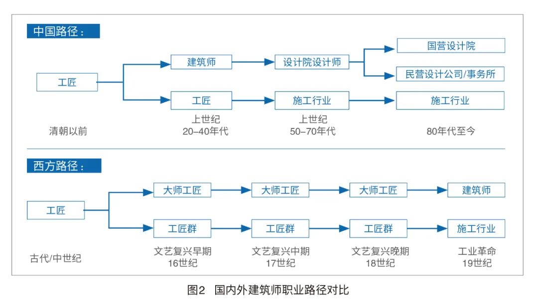 关于建筑师们有没有作为领导(Leader)组建并带领团队向市场成功交付项目的能力,曾一度成为业内讨论和争议的焦点话题。过去70多年,由于建筑行业管理体制和上位法的原因,中国建筑师们被“隔离”在建设项目实施的大部分过程之外,失去了参与除设计以外的大多数建设过程的机会。工作内容和业务范围压缩,限制了建筑师专业经验的积累和职业能力的成长,也在行业里形成了建筑师“只负责画图、不问交付结果”的现象,更造成了很多设计企业内建筑专业被逐渐边缘化的问题。但是,建筑师毕竟是建筑行业中唯一集艺术创作与项目管理才能于一身的“天之骄子”,有着与生俱来的创新思想和开拓意识,所缺少的不过是历练的机会和成长的土壤(图2)。