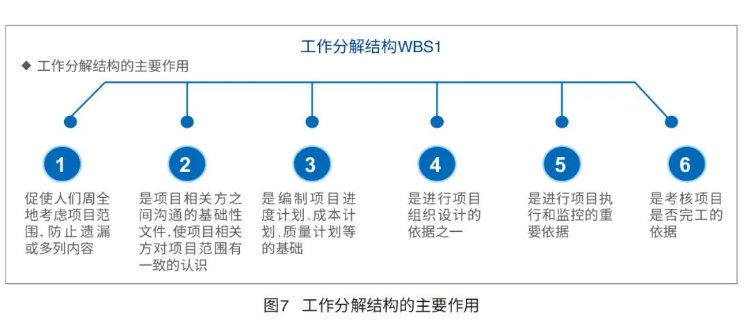WBS的是Work Breakdown Structure(工作分解结构)的缩写,通俗来讲,WBS就是要将合同中约定的所有工作范围层级分解。通过工作分解来不遗漏地考虑项目范围,是项目管理工作的起点。范围基准是项目相关方沟通的共识基础,是项目资源需求分析的输入,是成本、进度等基准设定的前提,是项目执行和管控的依据,有利于确保项目工作与责任分配矩阵(RAM)和组织分解结构(OBS)适当关联(图7)。