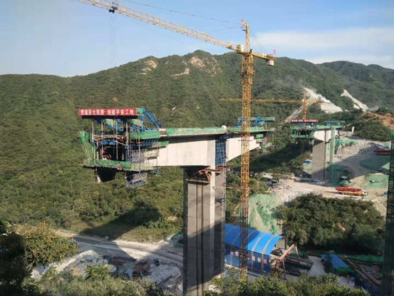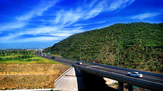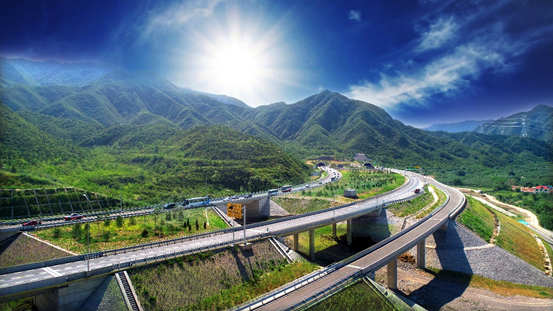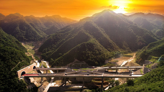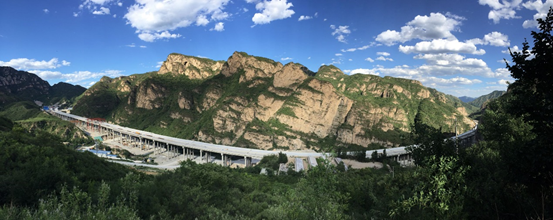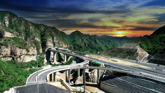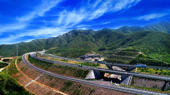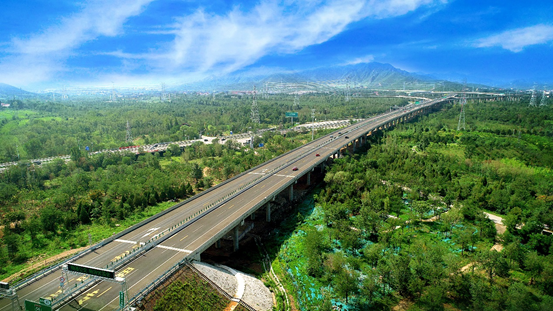 4、桥梁结合地形地貌布设桥位,减少对环境破坏,加强抗震设计的同时,尽量采用标准化预制拼装结构,保证工程质量,降低工程造价。5、采用主动防冰雪路面、高模量沥青混合料、沥青混合料温拌技术及阻燃沥青,有效解决冬季雨雪天气的运行安全及路面的耐久性问题,节能减排,体现绿色公路的建设理念。▲ 梯子峪桥及梯子峪停车区匝道桥