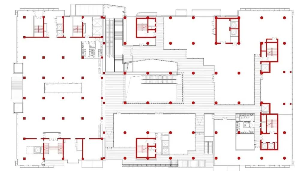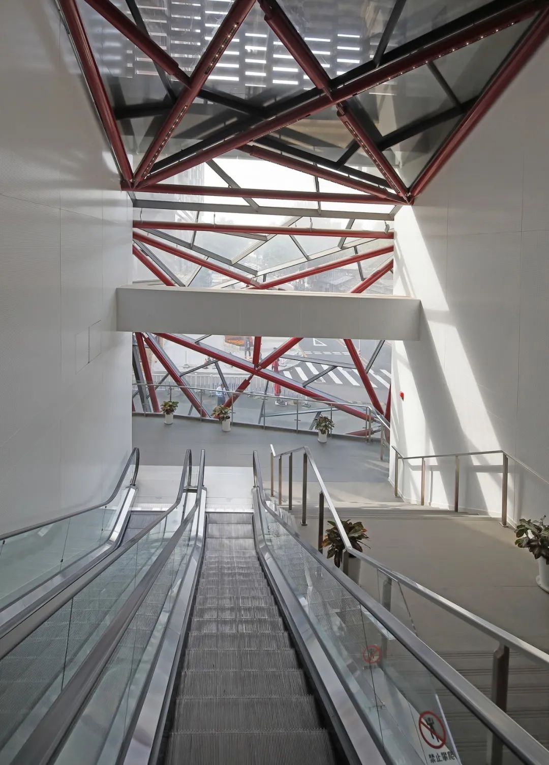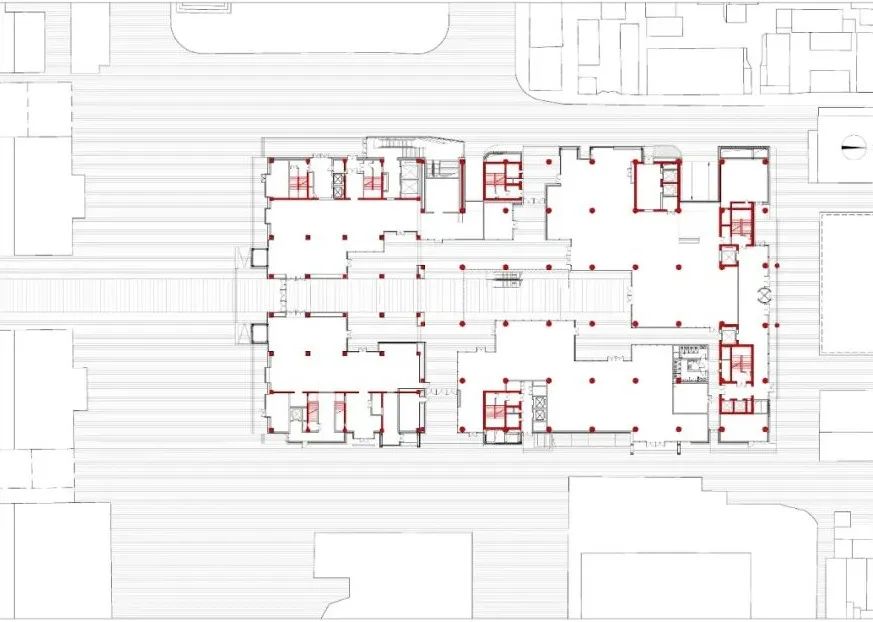 作为改造项目,与一般新建的商业办公综合体相比,隆福大厦并没有集中的所谓塔楼核心筒。我们将办公大堂提升,设置在首二层商业之上的三层。这个办公大堂通过东西两个方向直达地面的扶梯与外部城市衔接,并设置了咖啡厅、接待、展览等服务功能,而从地面层到三层的不同属性的公共空间叠加,形成了新隆福大厦低层范围的立体街区。