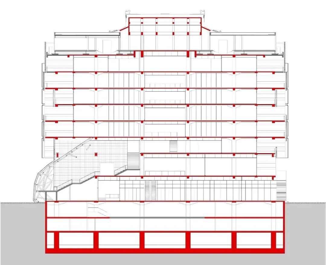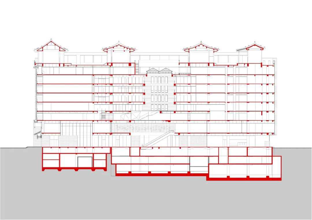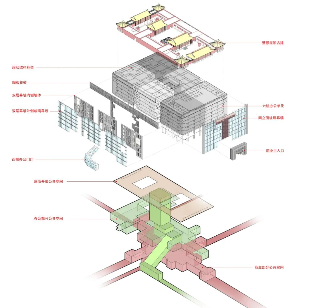 作为街区更新的第一步,隆福大厦的改造率先启动具体设计与实施工作。新隆福大厦的定位不再是一栋商业建筑,而是以文化创意办公为主,在低区和屋顶层配置服务型商业等公共功能的办公综合体。