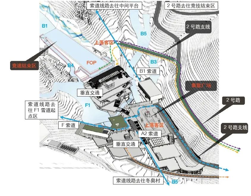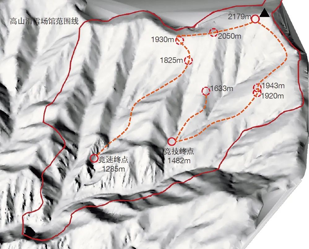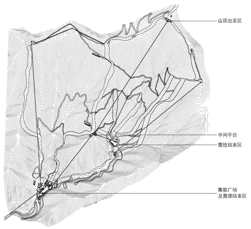 国家高山滑雪中心共设3条竞赛雪道、4条训练雪道以及其他联系雪道和技术雪道,各类雪道总长度约为23.1km,最大垂直落差约925m。赛区内设置竞速与竞技两个结束区,是服务赛事的核心区域,具备竞赛终点、观众观赛、赛事组织、交通集散等多种功能,两个结束区以道路、索道及雪道相连。以往国际赛事雪道多按男子与女子技术难度不同,分设两条比赛主雪道,国家高山滑雪中心雪道设计以竞速与竞技项目划分为两条主雪道,另加一条团体赛道,在滑降雪道中段设置了足够的空间便于滑行线路的调整,以适合男子女子共用一条雪道滑行,满足各项比赛的要求(图5)。
