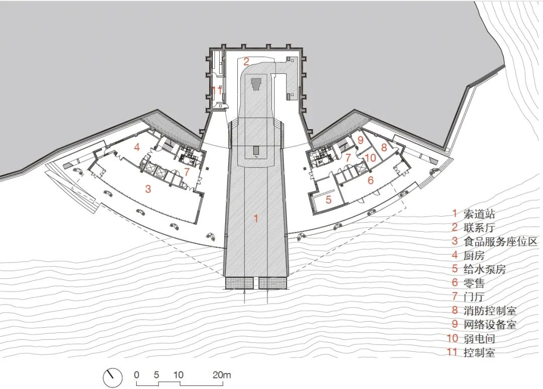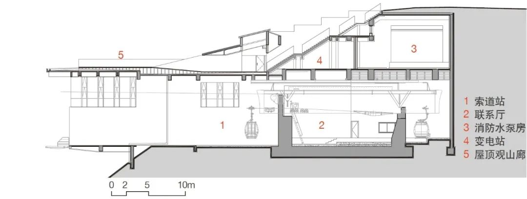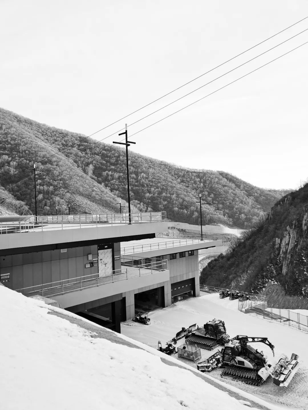 在两个结束区集中应用迭台形式之外,索道A、B线路各设置有中间站,A线路中站海拔标高1041m,是延庆冬奥村到集散广场之间转角站(图32),B线路中站(即中间平台,同时也设有C线路下站,在此由B换乘C至山顶出发区)海拔高度1554m,是集散广场到竞技结束区的转角站(图33)。设计将中间站视作集散广场的“延伸”,形式选择上也将其整合到上述策略中去。