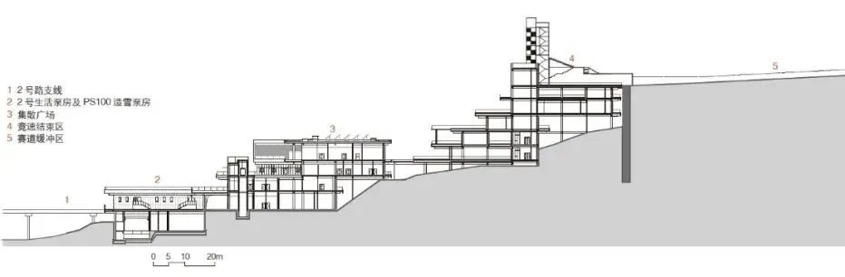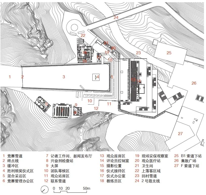竞技结束区围绕G1竞技雪道和D2团体赛道合用的缓冲区设置(位于海拔1478m以下的沟坎),自身要承担一部分交通集散功能,同时还要在有限的场地内调和观众看台场地与功能用房布局关系,也是经过多轮布局调整,至2018年6月方确定看台区与功能区平台水平并置的布局方式(图28~31)。