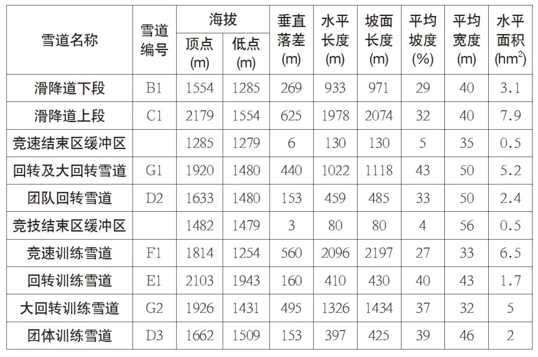 与每条竞赛雪道相对应,国家高山滑雪中心同时设置4条训练雪道和1条雪板测试雪道。F1雪道为竞速训练雪道(图14),位于西侧山脊之上,垂直落差560m,坡面长度2092m,平均坡度28%,其中最大坡度68%,并设置F吊椅索道与之配套。G2为大回转训练雪道,平行紧临于G1雪道东南,垂直落差493m,坡面长度1600m,平均坡度34%,其中最大坡度73%也是整个赛区坡度最陡之处,设置G吊椅索道与G1、G2雪道配套。E1雪道为回转项目训练雪道,垂直落差153m,坡面长度485m,平均坡度33%,其中最大坡度57%,设置E吊椅索道与之配套。D3雪道为团体项目训练雪道,位于D2雪道西侧沟谷之中,垂直落差153m,坡面长度425m,平均坡度39%,其中最大坡度49%,设置D吊椅索道与D2、D3雪道配套。C2雪道上半段为雪板测试道,位于山顶出发区东南向山脊,垂直落差65m,坡面长度180m,平均坡度37%,其中最大坡度54%,下半段与E1雪道相连接(表1)。
