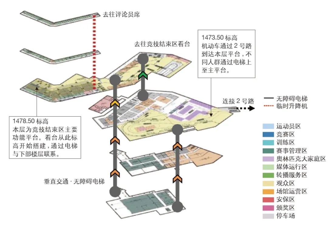 相对设施化的建筑语言反映了国家高山滑雪中心“低调而消隐”(Low-pitched and Hidden) [2]的设计态度。对材料品类的筛选提炼也是对山地建筑完成度的控制策略;考虑山地运输及安装条件,预先做了小尺度的板块划分,板材多采用开缝处理,减少施工工序;山地环境类别和严寒气候分区要求设计对材料耐候性、耐久性、抗冻性、吸水率等相关技术参数严格控制;扶梯、电梯相应采取桁架内及井道内设置加热设备来应对高山环境可能出现的极寒天气;对停车及压雪车过车平台混凝土面层材料的抗盐冻性要求进行了专家论证,采用F50抗冻混凝土配筋面层切实可行的解决方案。▶ 建筑设计-设计组织