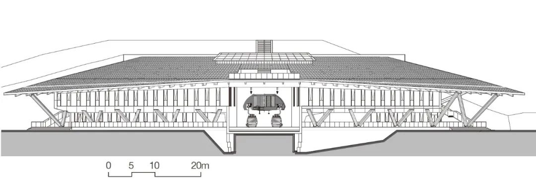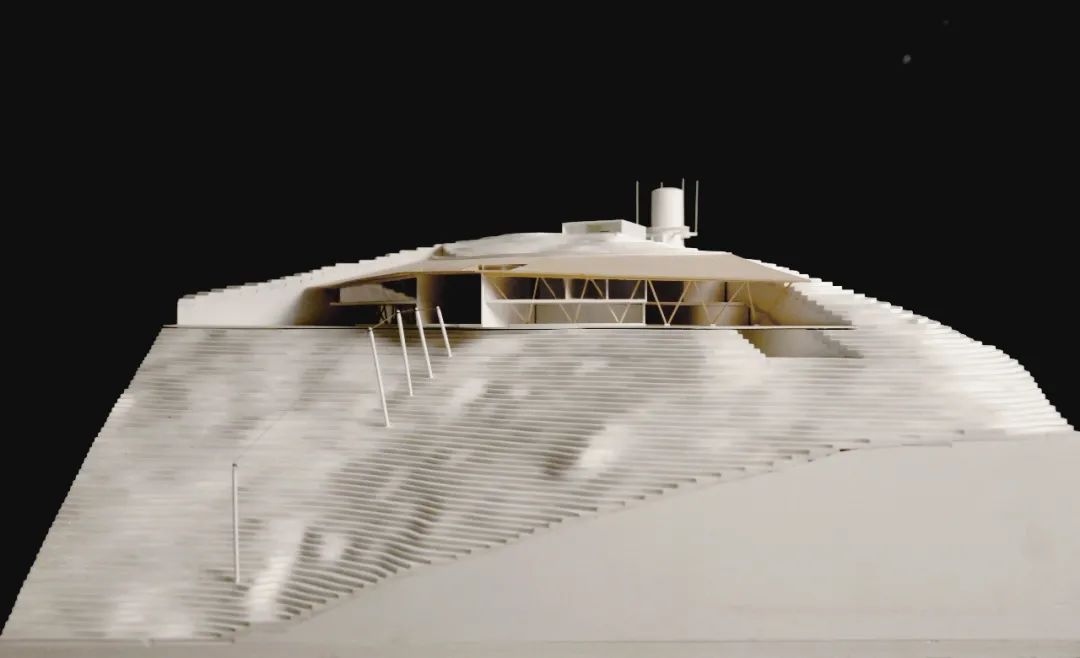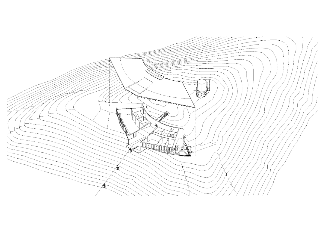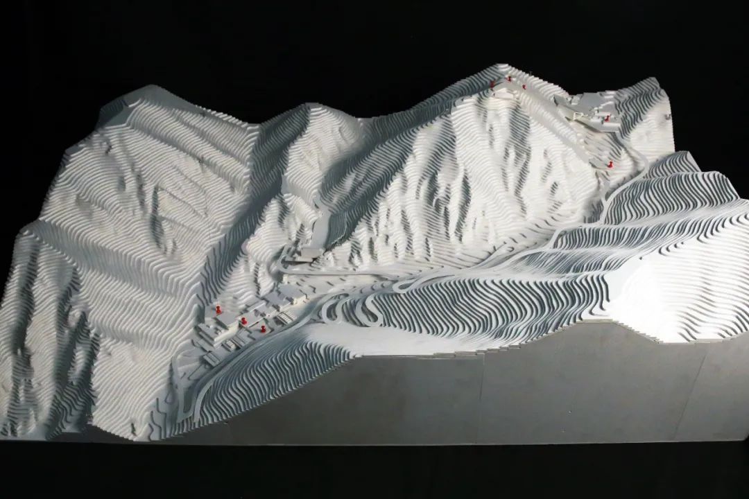 以上区域建筑沿山体错迭布局,利用屋面形成挑廊及室外活动平台,平台之间采用均匀分布的竖向交通系统进行交通联系,极大地化解了山地建筑对无障碍需求人群使用的不便。平台赛时满足临时设施布置及功能扩展需求,赛后可转换为室外活动场地。平台下部结构采用网格状钢框架结构,为赛后功能扩充预留可能性。设计合理配置永久建筑、临时设施和使用场地数量和规模,贯彻场馆的可持续利用和环境的可持续发展设计理念,实现“可逆式”发展。出发区的设计策略则需要更多地引入关于奥运的文化主旨去回应承办国家特色的宏大命题。协调建筑与自然的关系就是我们文化的一部分。山顶出发区建筑内部容纳索道站并提供运动员休息空间。根据索道安全运行的场地水平长度需求,进行了适量土方开挖,形成半覆土建筑,设计控制建筑体量,最高点不高于小海坨峰顶的海拔高度,表达对自然的敬畏(图34、35)。山顶出发区拥有独特的景观视野,外立面从外到内考虑深远挑檐、廊道露台、遮阳景窗等空间化设计方式,综合解决了功能、节能和美观的多方面需求。建筑以坡屋面回应中国传统建筑的历史渊源,以朴实的木瓦作为屋面材料体现地域及场所特征,表明本届冬奥会承办国家的文化特质,同时坡屋面造型经过了几何化操作,又赋予其一定的独特性和当代性(图36)。顶部设置的观山廊和“长卷”景窗提供了可以远眺国家雪车雪橇中心、延庆冬奥村和山地新闻中心的平远景致,一幅胜景映现于观者的眼前(图37),错综的赛道拟合于海坨山脉,正如雏燕之形,暨场馆“雪飞燕”命名的由来。▲ 图34 山顶出发区(含天气雷达站)模型