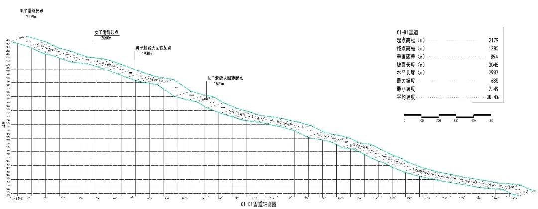 竞速雪道由上下两段(C1+B1)雪道组成,主要承担滑降与超级大回转的比赛,雪道位于用地的中轴对角线上,起点高程2179m,终点高程1285m,垂直落差894m,平均宽度40m,坡面长度3045m,平均坡度为30%,其中最大坡度68%,最小坡度7.2%(图7、8)。竞速雪道缓冲区长度140m,最宽处130m,坡度5%,场地面积约1.26万㎡,满足赛事各项综合需求。