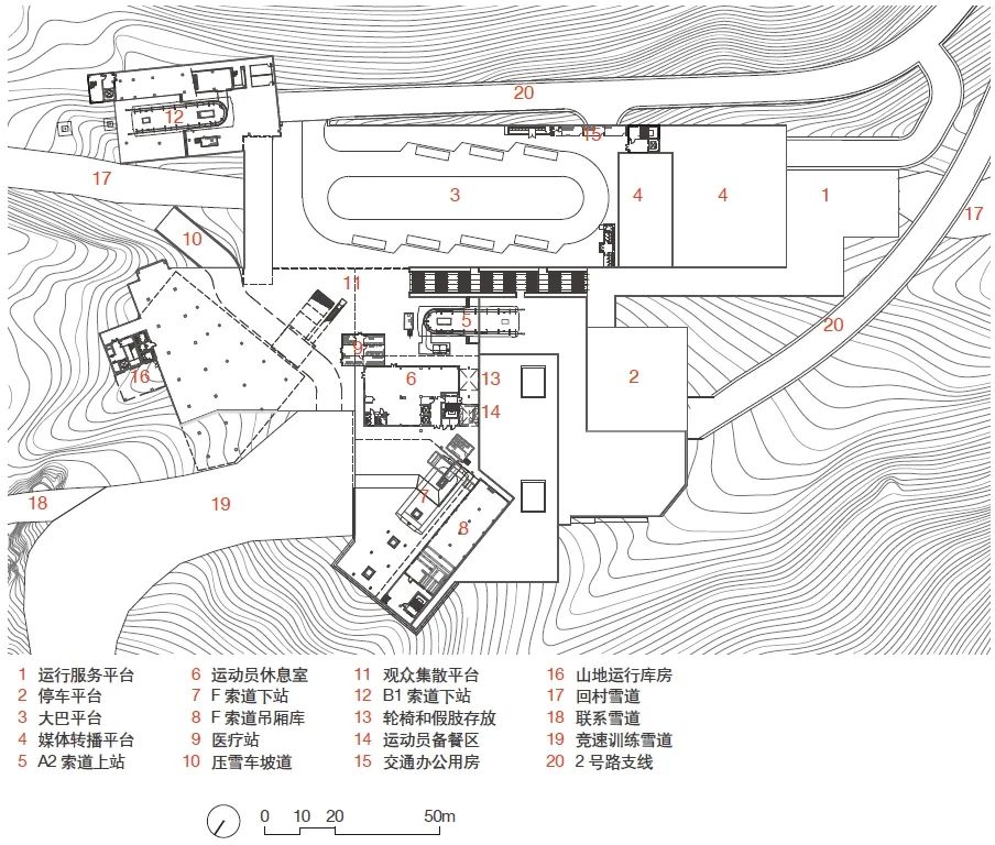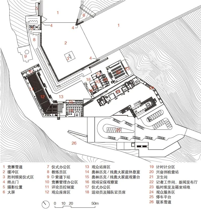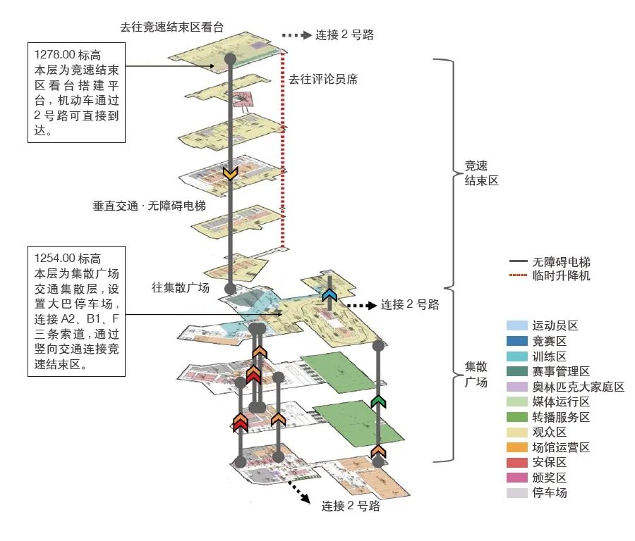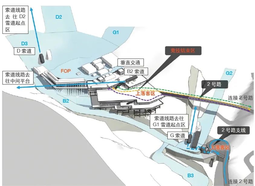 ,是国内第一座按冬奥赛事标准建设的高山滑雪场馆,将进行北京2022年冬奥会和冬残奥会高山滑雪所有项目的比赛[1]。国家高山滑雪中心位于延庆赛区核心区北部小海坨山南麓区域,整个用地近似菱形。顶端最高点为小海坨峰(2198.38m),以此峰向西南与东南沿山脊线方向延伸,底端汇聚于佛峪口沟上口(1238m)。整个地势为各条沟谷从东北小海坨峰向下汇聚至西南角沟口,海拔高差约为960m,山体坡度大多在40%以上,满足冬奥会高山滑雪竞赛场地的需求。▲ 从赛道出发区俯瞰竞速雪道、中间平台、竞技结束区(远景为国家雪车雪橇中心)小海坨山地处温带大陆性季风气候区,为典型的山地小气候区,冬冷夏凉,冬季严寒干燥多风,最低1月份平均气温-8.36ºC,山顶极端气温可达-37ºC;冬季平均积雪深度14.6cm;年平均湿度为55%,最低湿度为34.6%;冬季山顶平均风速最大值22.6m/s。其特殊的地理位置(河北张家口与北京之间)、优越的地形地势条件和理想的海拔高度,使其成为北京2022年冬奥会和冬残奥会高山滑雪项目场址的最佳选择。第24届冬奥会工作领导小组第四次全体会议审议通过《北京2022年冬奥会延庆赛区核心区场馆及设施规划设计方案》,国家高山滑雪中心基地面积432.4h㎡,其中建设用地约6h㎡,永久建筑面积约4.3万㎡,其中室外建筑面积(挑廊、平台、楼梯等)约1.1万㎡。根据国际奥委会(IOC)提供的竞赛场馆设计大纲(Venue Brief)2)通用文件及北京冬奥组委(BOCOG)各业务领域 3)的实际空间需求,赛时总体空间需求5.9万㎡。设计落实各业务领域功能需求和各类人群 4)流线。容纳核心功能的永久建筑及临时设施分散布局,围绕雪道规划形成集散广场及竞速结束区、竞技结束区、山顶出发区等主要建设区域(图1)。赛区内共配置11条索道(编号A-H),解决从延庆冬奥村至集散广场再到各功能区的主要交通需求。同时,为提高交通运输保障能力,保证媒体转播及冬残奥会的运行需求专门设置了2号市政道路,该道路由延庆冬奥村通至集散广场及两个结束区,道路总长度约7.6km,平均坡度8%。▲ 图1 国家高山滑雪中心主要功能区域分布