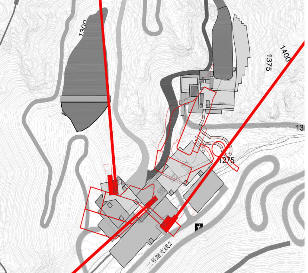 ▲ 图26 集散广场及竞速结束区楼层平面分解▲ 图27 B1雪道延长段保留的天然“山石”