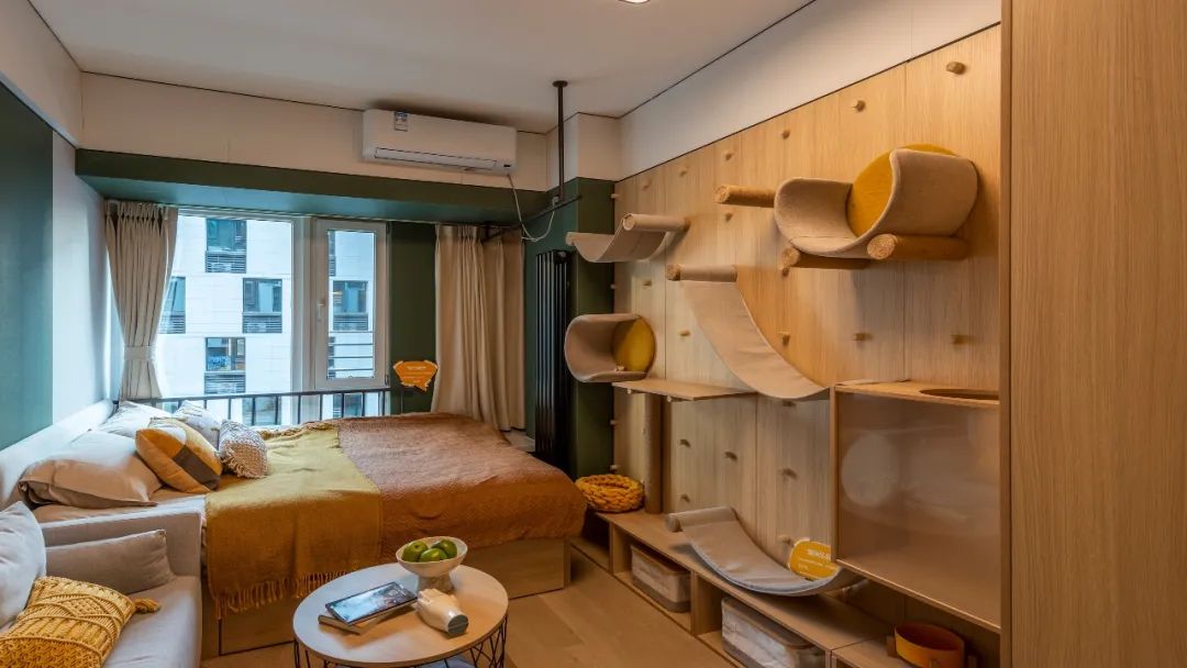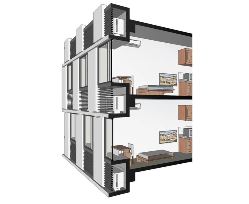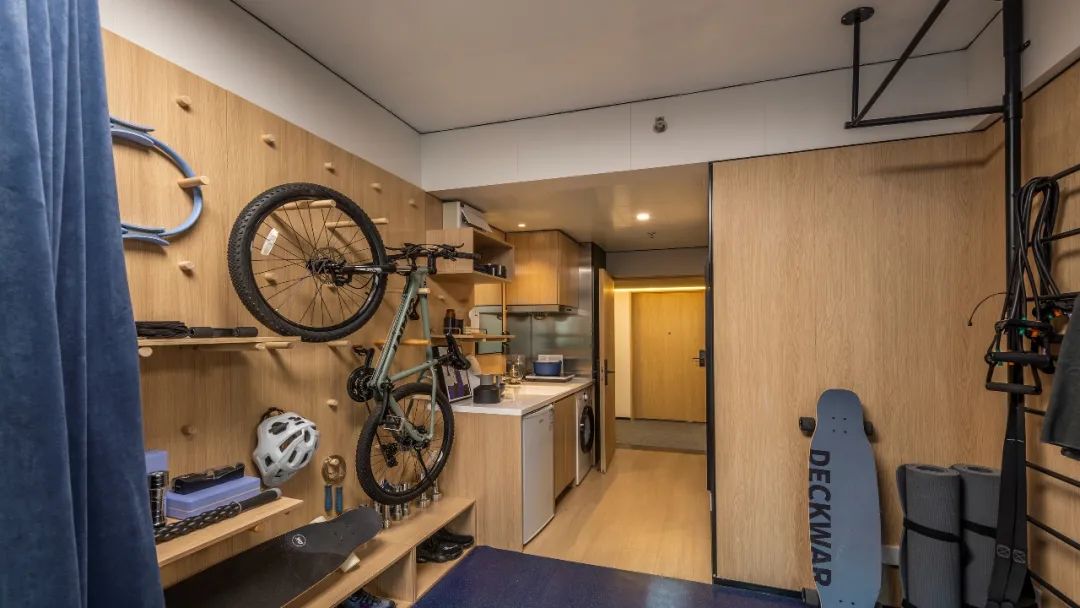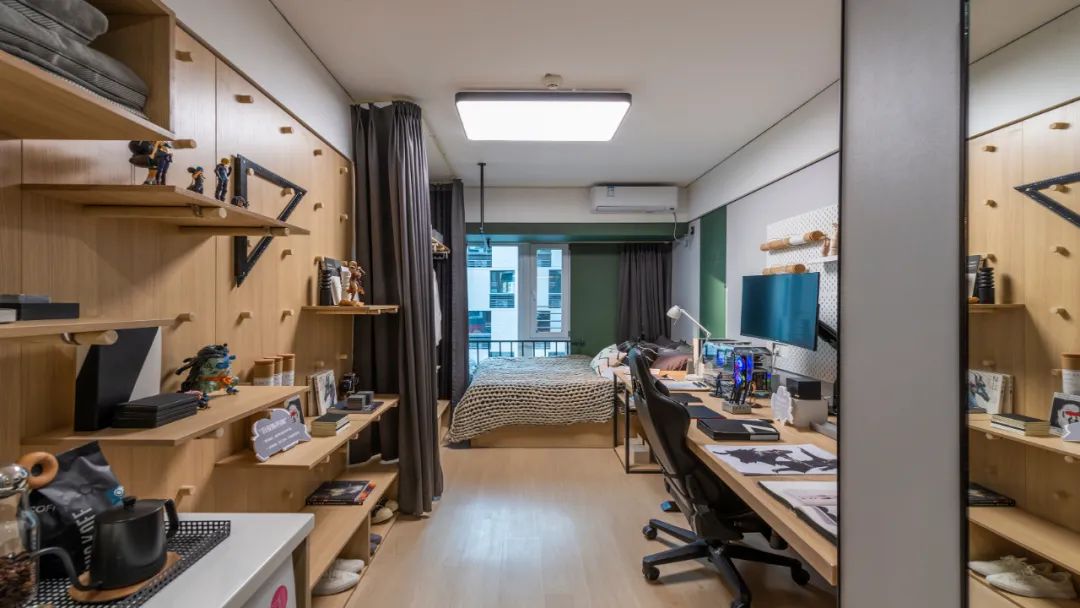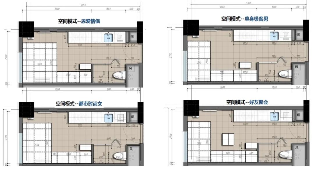 模数控制下的多变套内空间 通过产品经济测算,在平均每户建筑面积25㎡的要求下,结合框架式8.4m柱网,得出户型面宽为2.8m。在此基础上,室内设计团队(九和空间设计)通过对青年人生活方式的行为和需求研究,将套内功能划分为睡眠、装扮/储物、娱乐/工作、焕新四大区域,并以300mm/150mm模块进行室内不同场景的精细化设计,利用装配式家具模块的方式形成内装灵活可变的快速搭建。在此基础上,将青年客群进行细分,形成不同主题的室内空间供选择,实现模块控制下的定制化服务,满足年轻人对居室空间的个性化追求。