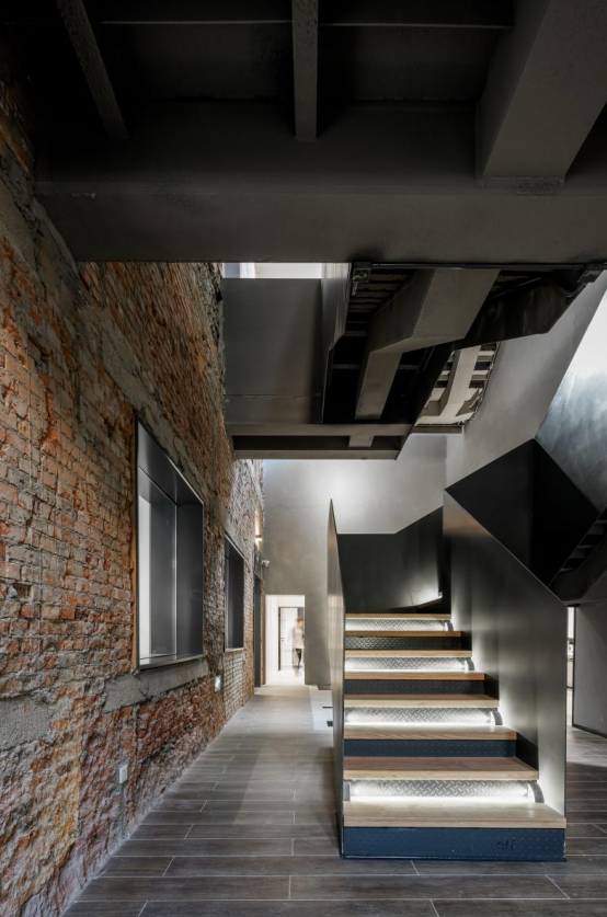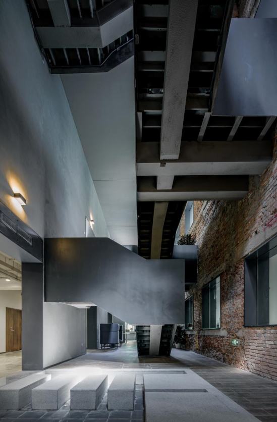 室内整体装饰尽可能多的展示出建筑改造的新旧对比,并未追求过多的表面装饰,整体原则以展示原本建筑和材料的真实属性为主,局部通过新旧材料的对比形成强烈的反差,制造了一定的戏剧性。