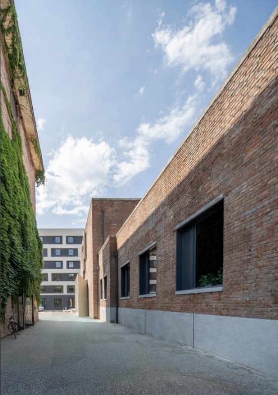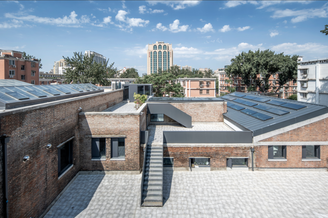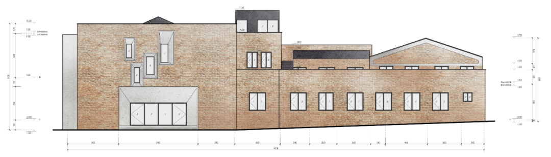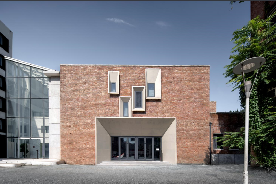 整合园区内的公共空间,变消极为积极。我们在保持建筑原有风貌的的前提下,尽量提高立面的品质,打造有亲和力的积极的立面。建筑外立面沿用了现状最初的清水砖墙外立面,对现存状况较好的立面做了相应清洗,修补状况不佳的立面。建筑东立面将原本饭店加建的仿古门头彻底拆除,新建清水混凝土门头,强化了建筑主入口的仪式感,二层通过与一层相似形体的变化设置了4个清水混凝土外窗框,改善了二层东侧区域的采光条件。