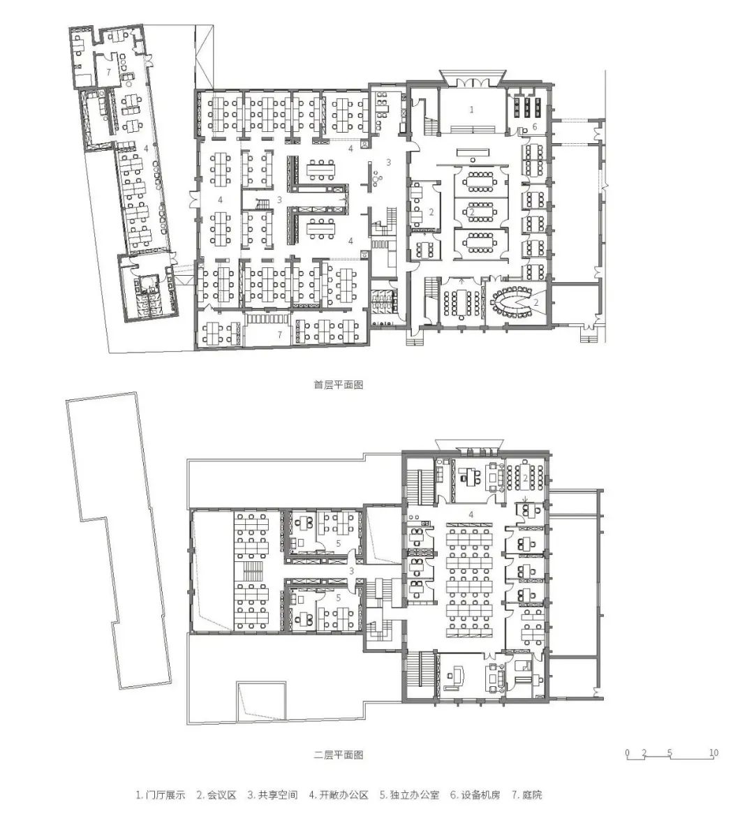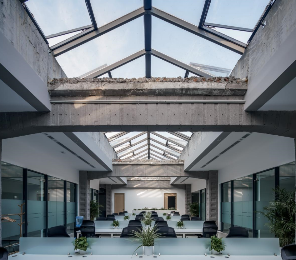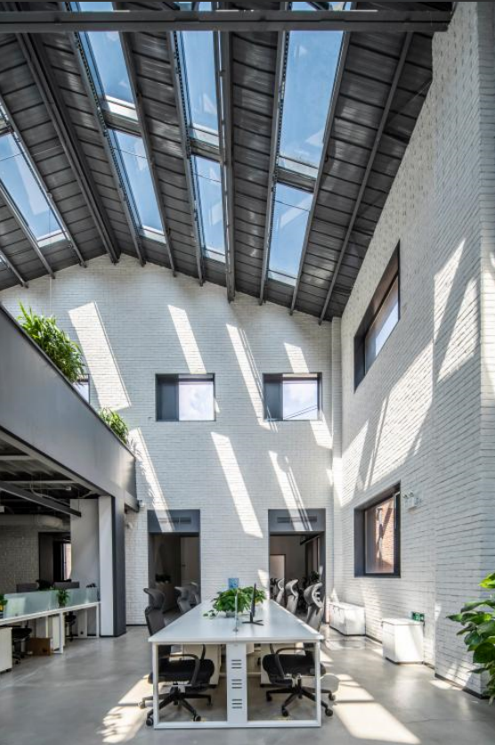 通过结合现状有机改造更新,改造后的建筑能作为满足现代办公的场所服务于未来的适用人群。现有首二层空间均为办公空间及其辅助空间。首层营造了若干公共空间,供办公人群使用,通过局部楼板的拆除,设置了沟通交往厅,丰富了办公人群日常的行为沟通模式。二层利用原先废旧的烟囱空间局部增加梁板,将两侧的办公空间彻底连接,原本松散的建筑空间被统一的设计整合,能较好的适应现行办公空间的需求。从打造绿色办公空间的角度出发,设计中采用了多种手段,通过局部楼板的拆除设置了共享空间,布置室内绿植,在建筑西侧部分通过局部拆除设置了内院,有效解决了周围房间的采光通风问题,也提供了绿植的种植场地。