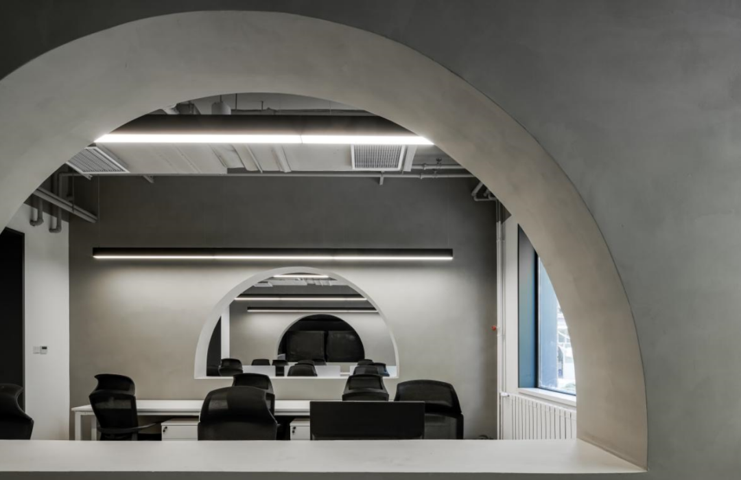 通过有机的设计手法化解既有建筑的不利条件。现状建筑有大量没有采光条件的小开间,为了改善未来办公条件,在隔墙上开设了半月形的月亮窗,将若干封闭隔绝的小空间的界限打破变成了流动的空间。原本用作厨房排油烟的烟囱构筑物,通过增设楼板,形成了连接南北两侧办公空间的交通空间,把不利条件变为有利条件。