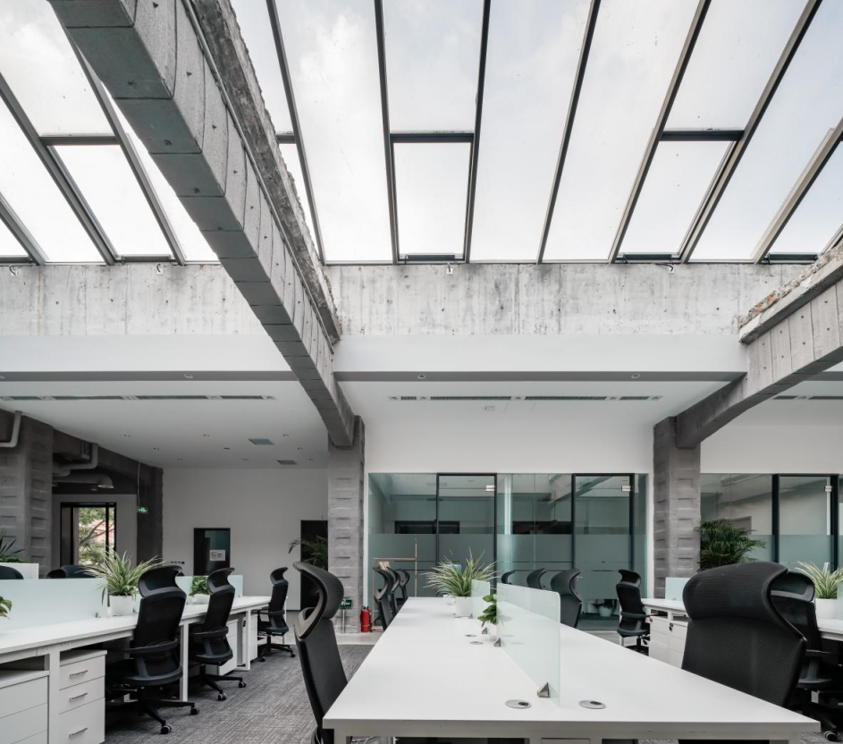 如何为未来可能的应用场景提供更多开放的建筑空间。由于在改造初期并未确定未来的实际办公承租方,为了能满足不同公司的办公需求,将办公空间定义为以开敞办公为主,辅助若干小间独立办公室,并且在后期的二次精装过程中贯彻了最初的设计思路,保留了整体的公共空间和开敞办公空间。